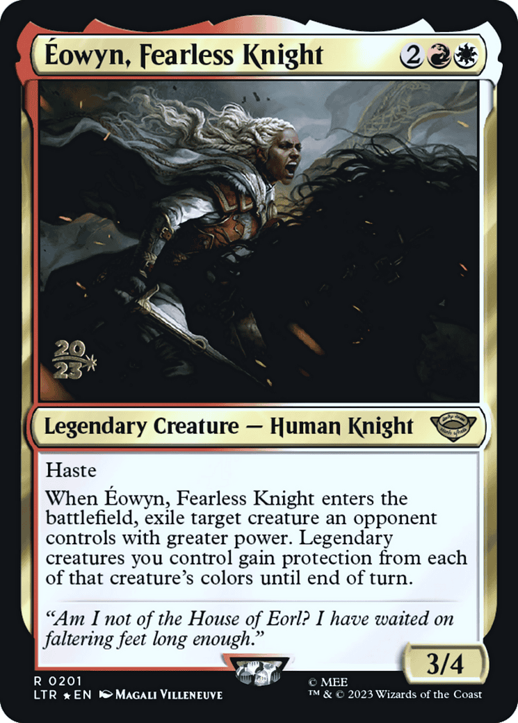 When Éowyn enters, exile target creature an opponent controls with greater power. Legendary creatures you control gain protection from each of that creature’s colors until end of turn.