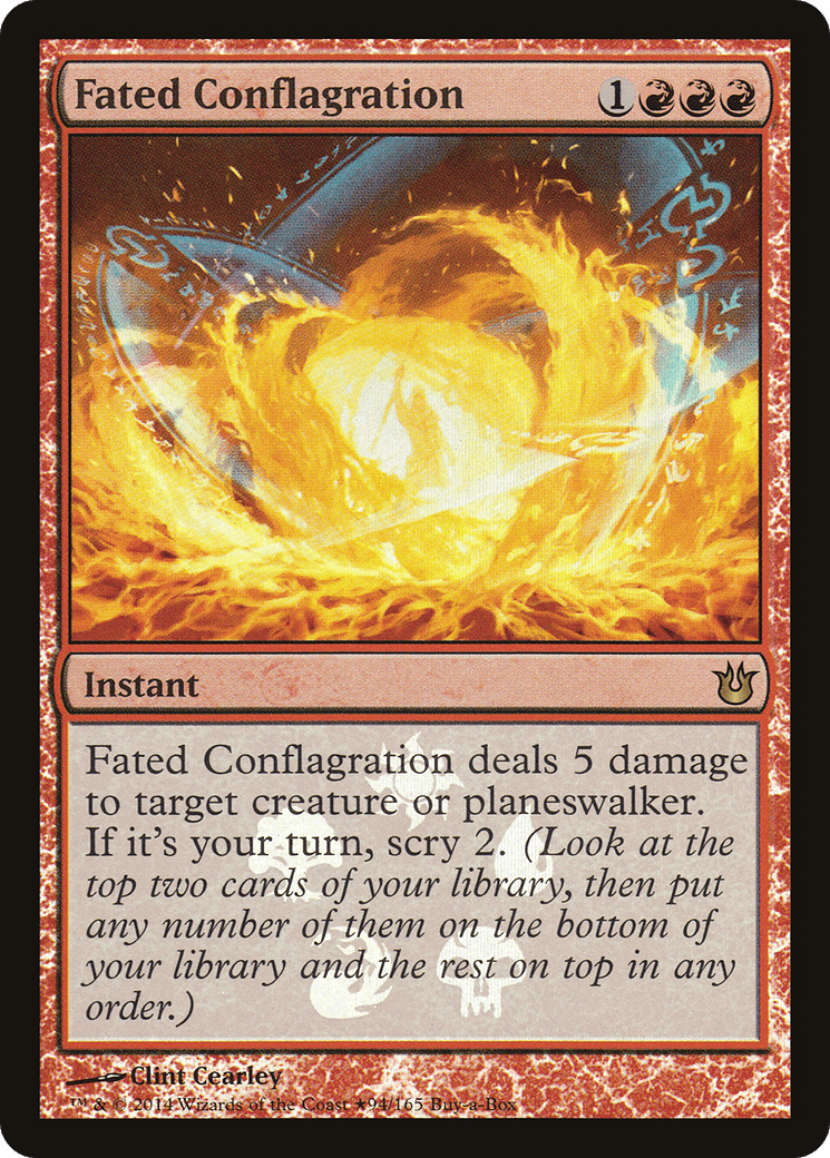 Fated Conflagration deals 5 damage to target creature or planeswalker. If it’s your turn, scry 2.