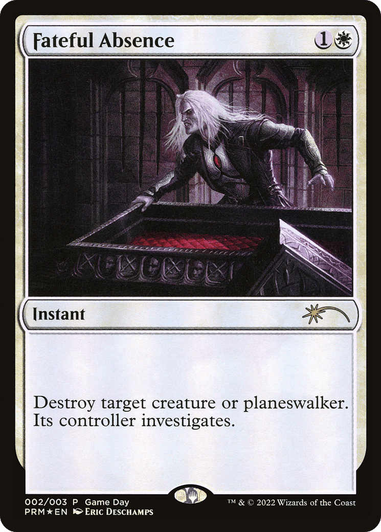 Destroy target creature or planeswalker. Its controller investigates. (Create a Clue token. It’s an artifact with “{2}, Sacrifice this token: Draw a card.”)