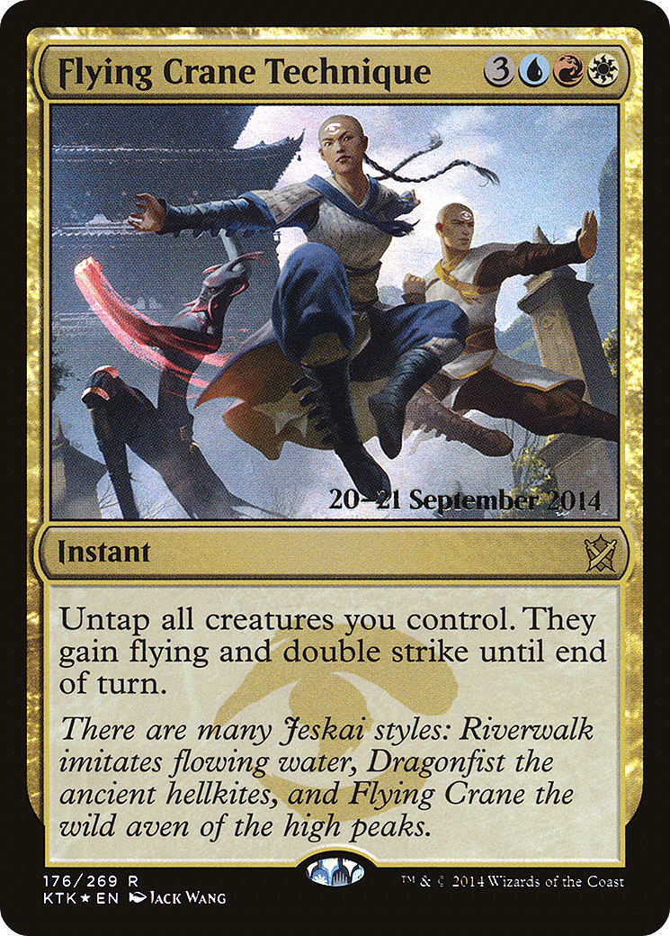 There are many Jeskai styles: Riverwalk imitates flowing water, Dragonfist the ancient hellkites, and Flying Crane the wild aven of the high peaks.