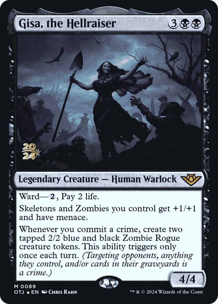 Whenever you commit a crime, create two tapped 2/2 blue and black Zombie Rogue creature tokens. This ability triggers only once each turn. (Targeting opponents, anything th