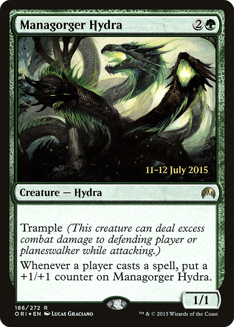 Trample Whenever a player casts a spell, put a +1/+1 counter on this creature.