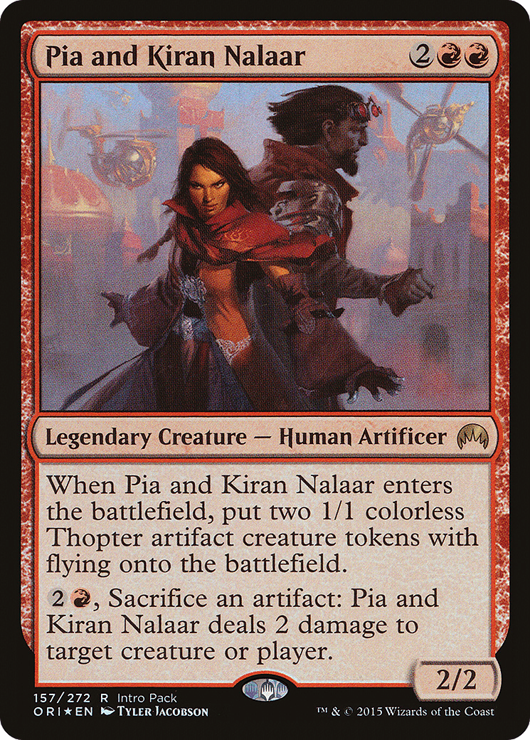 When Pia and Kiran Nalaar enters, create two 1/1 colorless Thopter artifact creature tokens with flying.