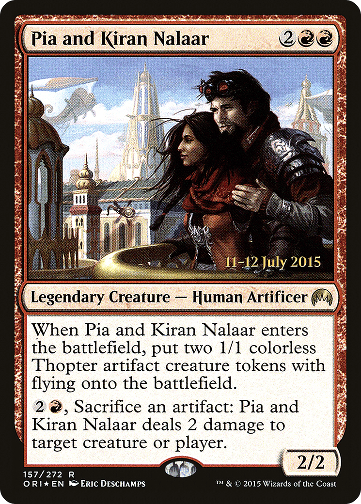 When Pia and Kiran Nalaar enters, create two 1/1 colorless Thopter artifact creature tokens with flying.