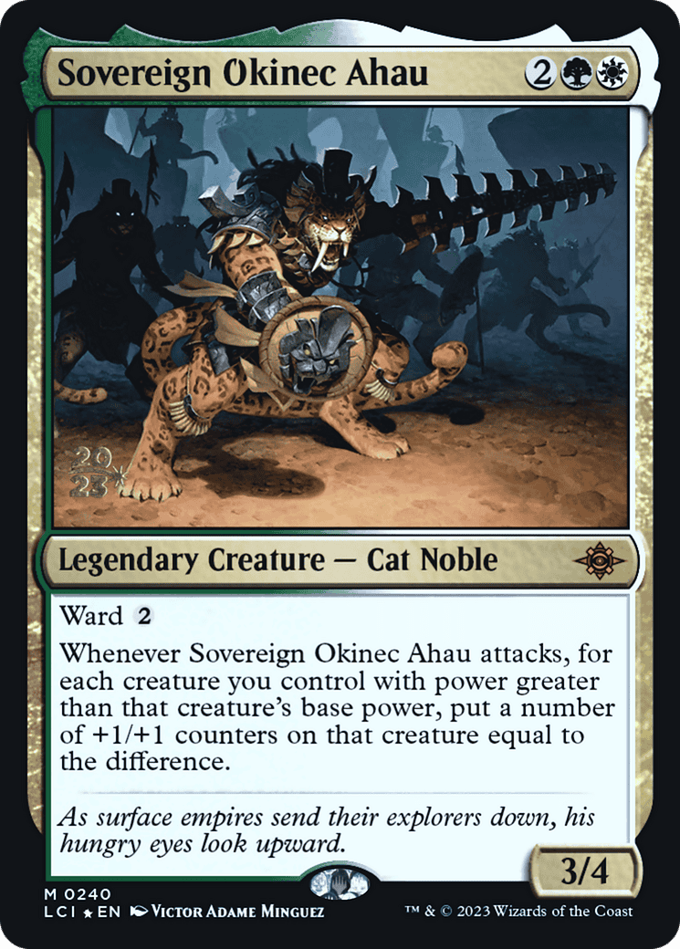 Whenever Sovereign Okinec Ahau attacks, for each creature you control with power greater than that creature’s base power, put a number of +1/+1 counters on that creature equal to the difference.