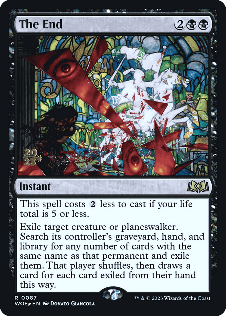 Exile target creature or planeswalker. Search its controller’s graveyard, hand, and library for any number of cards with the same name as that permanent and exile them. That player shuffle
