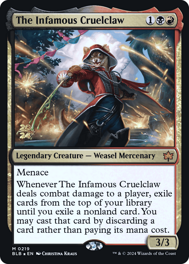 Whenever The Infamous Cruelclaw deals combat damage to a player, exile cards from the top of your library until you exile a nonland card. You may cast that card by discarding a card rather than paying its mana cost.
