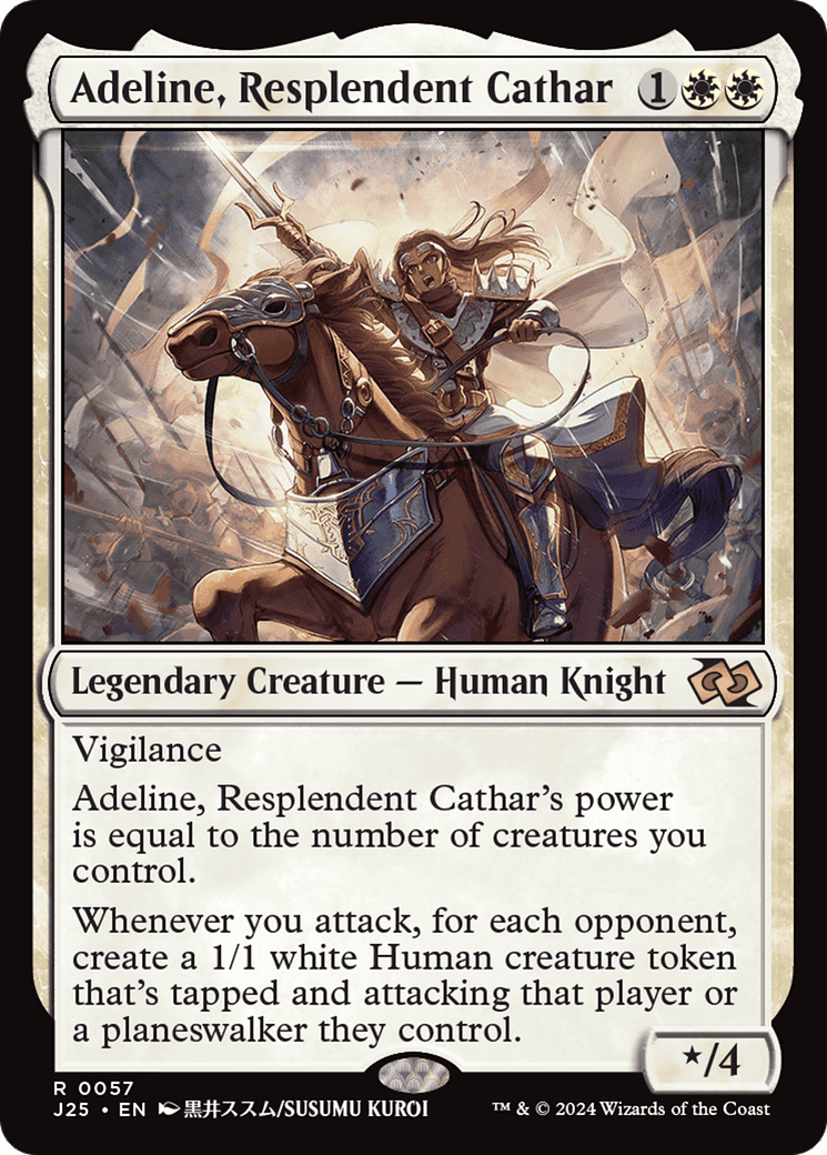Whenever you attack, for each opponent, create a 1/1 white Human creature token that’s tapped and attacking that player or a planeswalker they control.