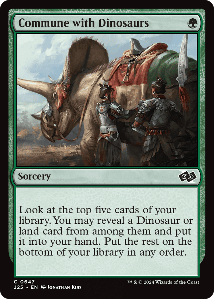 Look at the top five cards of your library. You may reveal a Dinosaur or land card from among them and put it into your hand. Put the rest on the bottom of your library in any order.