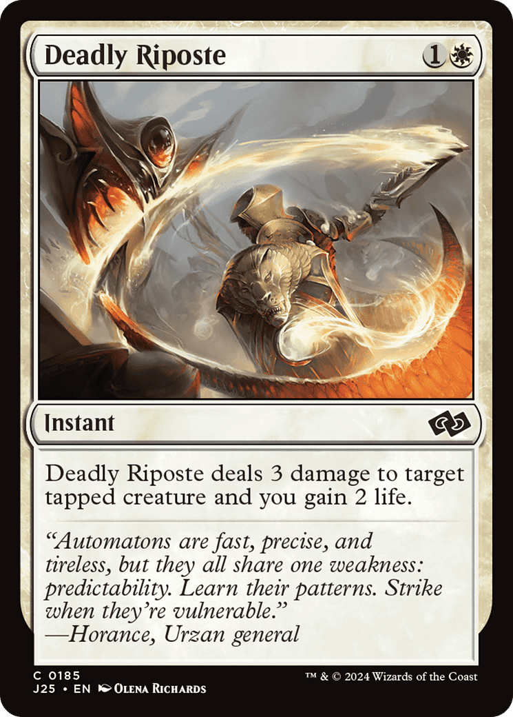 Deadly Riposte deals 3 damage to target tapped creature and you gain 2 life.