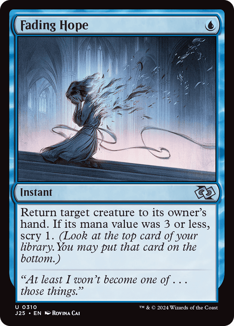 Return target creature to its owner’s hand. If its mana value was 3 or less, scry 1. (Look at the top card of your library. You may put that card on the bottom.)