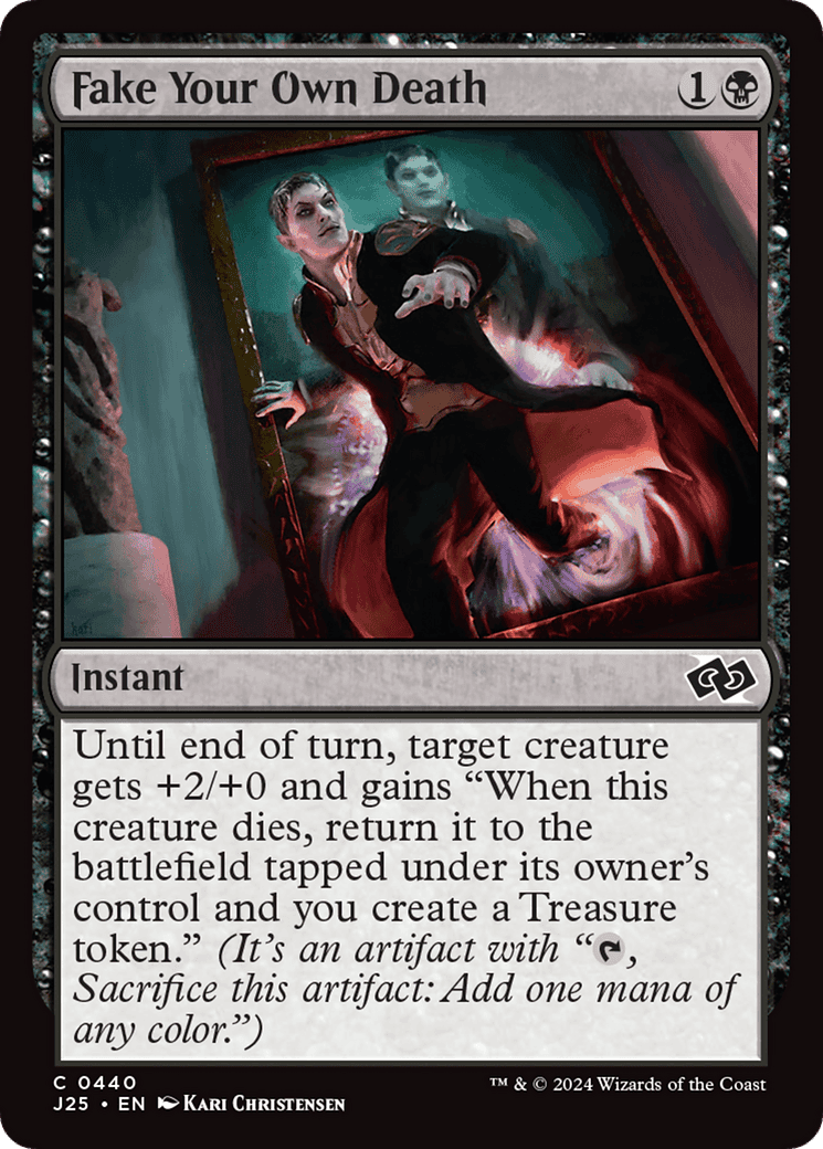 Until end of turn, target creature gets +2/+0 and gains “When this creature dies, return it to the battlefield tapped under its owner’s control and you create a Treasure token.” (It’s an artifact with “{T}, Sacrifice this token: Add one mana of any color.
