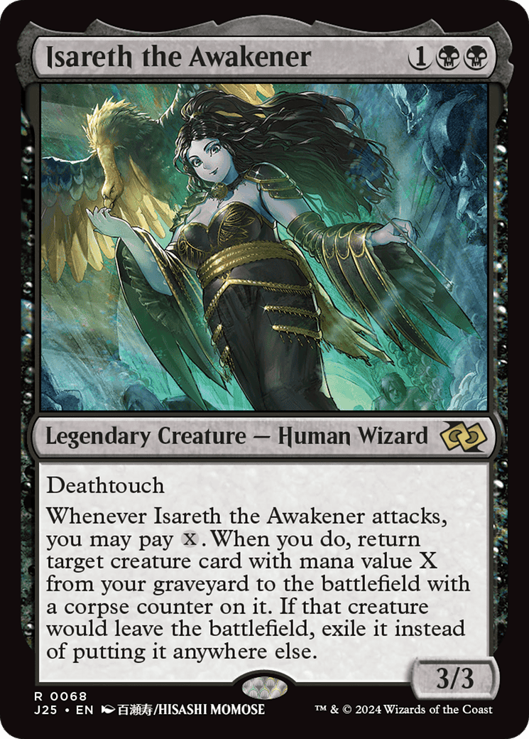 Whenever Isareth attacks, you may pay {X}. When you do, return target creature card with mana value X from your graveyard to the battlefield with a corpse counter on it. If that creature would leave the battlefield, exile it instead of putting
