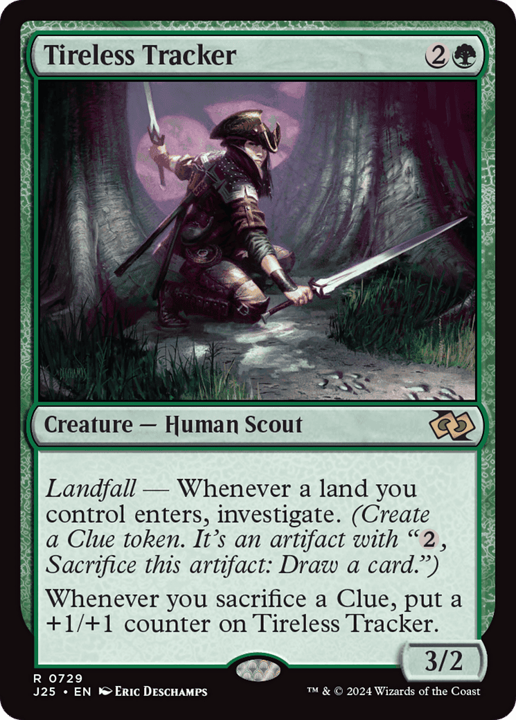 Landfall – Whenever a land you control enters, investigate. (Create a Clue token. It’s an artifact with “{2}, Sacrifice this token: Draw a card.”)
