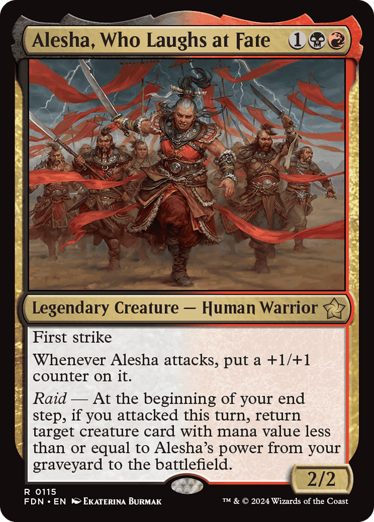 Raid – At the beginning of your end step, if you attacked this turn, return target creature card with mana value less than or equal to Alesha’s power from your graveyard to the battlefield.