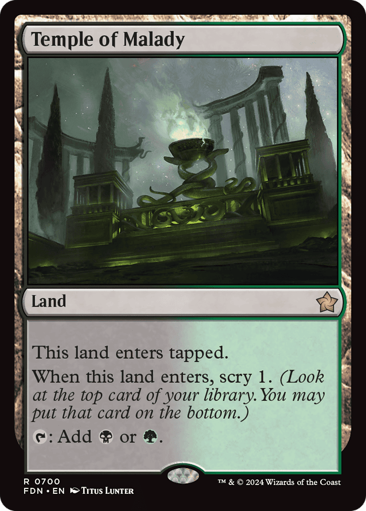This land enters tapped. When this land enters, scry 1. (Look at the top card of your library. You may put that card on the bottom.) {T}: Add {B} or {G}.