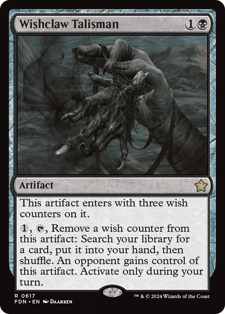 {1}, {T}, Remove a wish counter from this artifact: Search your library for a card, put it into your hand, then shuffle. An opponent gains control of this artifact. Activate only during your turn.