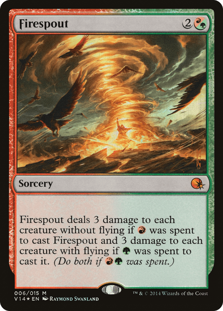 Firespout deals 3 damage to each creature without flying if {R} was spent to cast this spell and 3 damage to each creature with flying if {G} was spent to cast this spell. (Do both if {R}{G} was spent.)