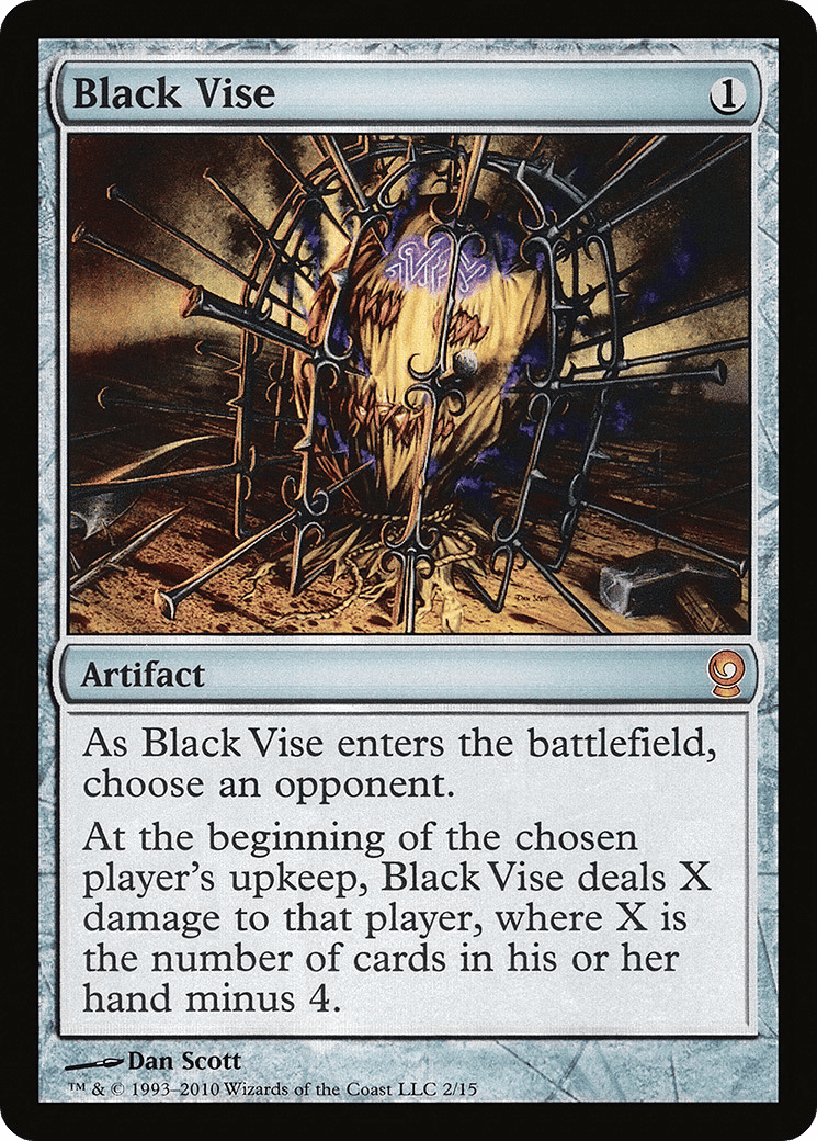 At the beginning of the chosen player’s upkeep, this artifact deals X damage to that player, where X is the number of cards in their hand minus 4.