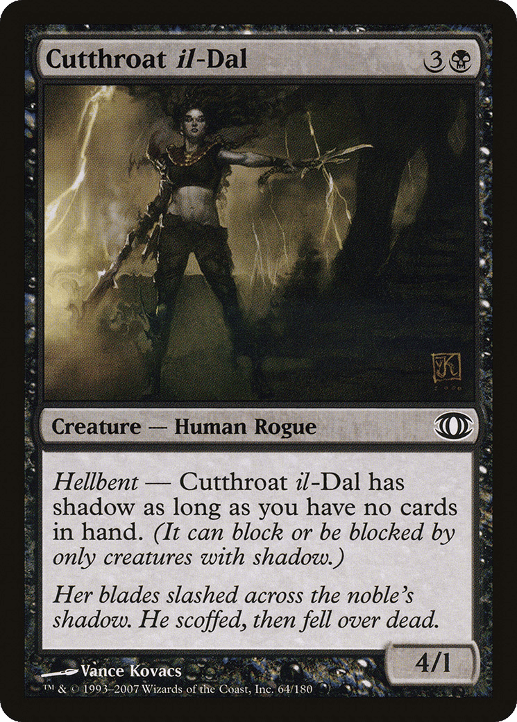 Hellbent – This creature has shadow as long as you have no cards in hand. (It can block or be blocked by only creatures with shadow.)