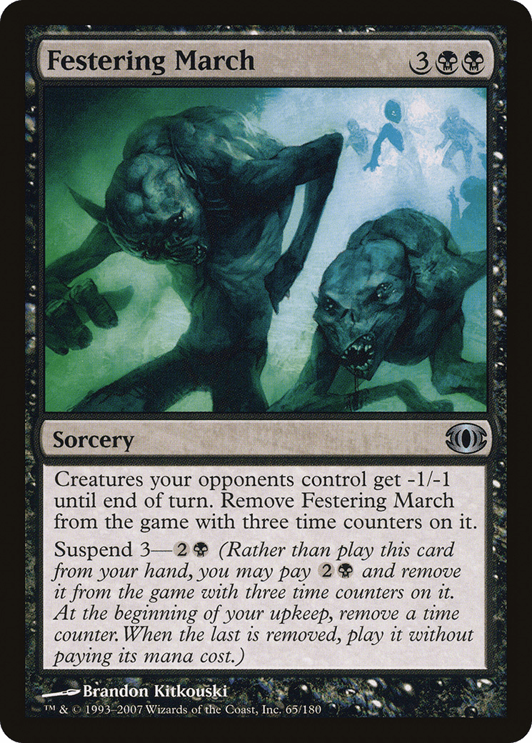 Creatures your opponents control get -1/-1 until end of turn. Exile Festering March with three time counters on it.