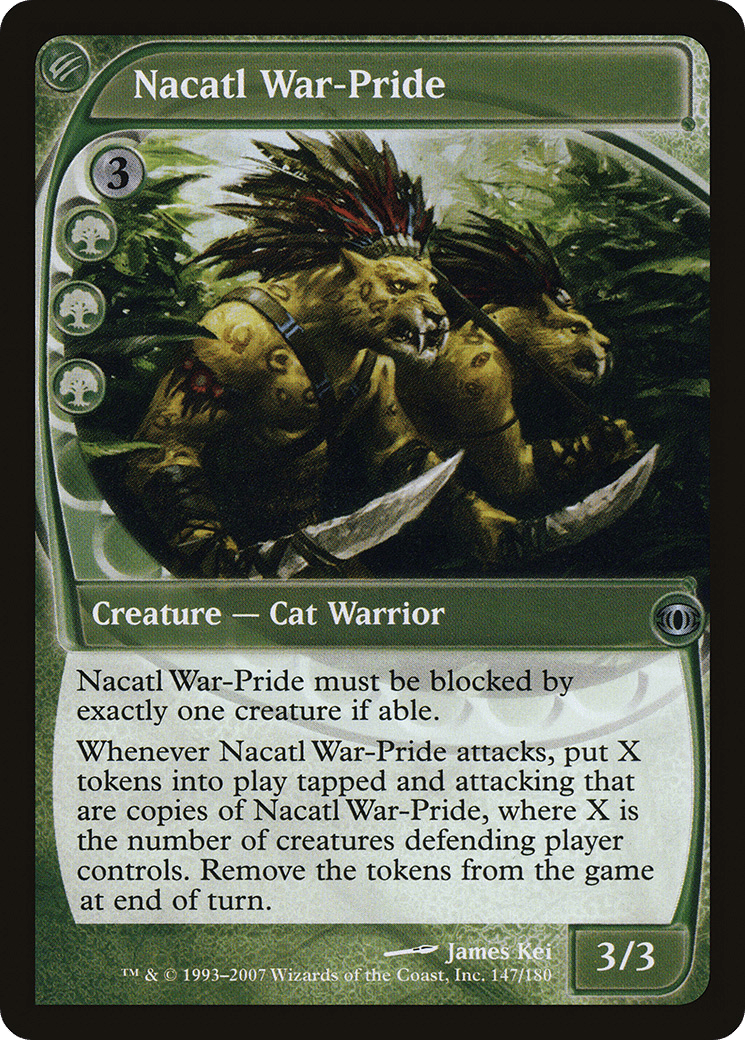 Whenever this creature attacks, create X tokens that are copies of it and that are tapped and attacking, where X is the number of creatures defending player controls. Exile the tokens at the b