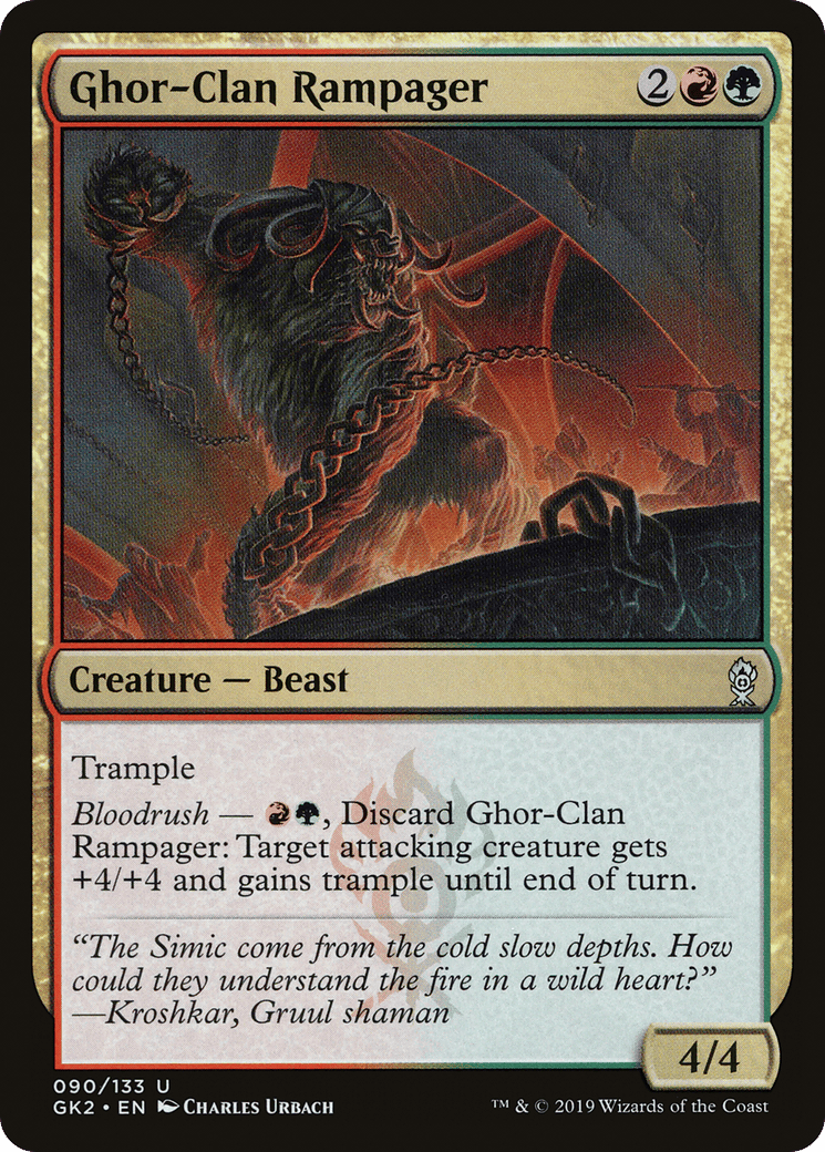 Bloodrush – {R}{G}, Discard this card: Target attacking creature gets +4/+4 and gains trample until end of turn.