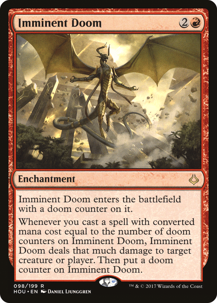 Whenever you cast a spell with mana value equal to the number of doom counters on this enchantment, this enchantment deals that much damage to any target. Then put a doom counter on this enchantment.