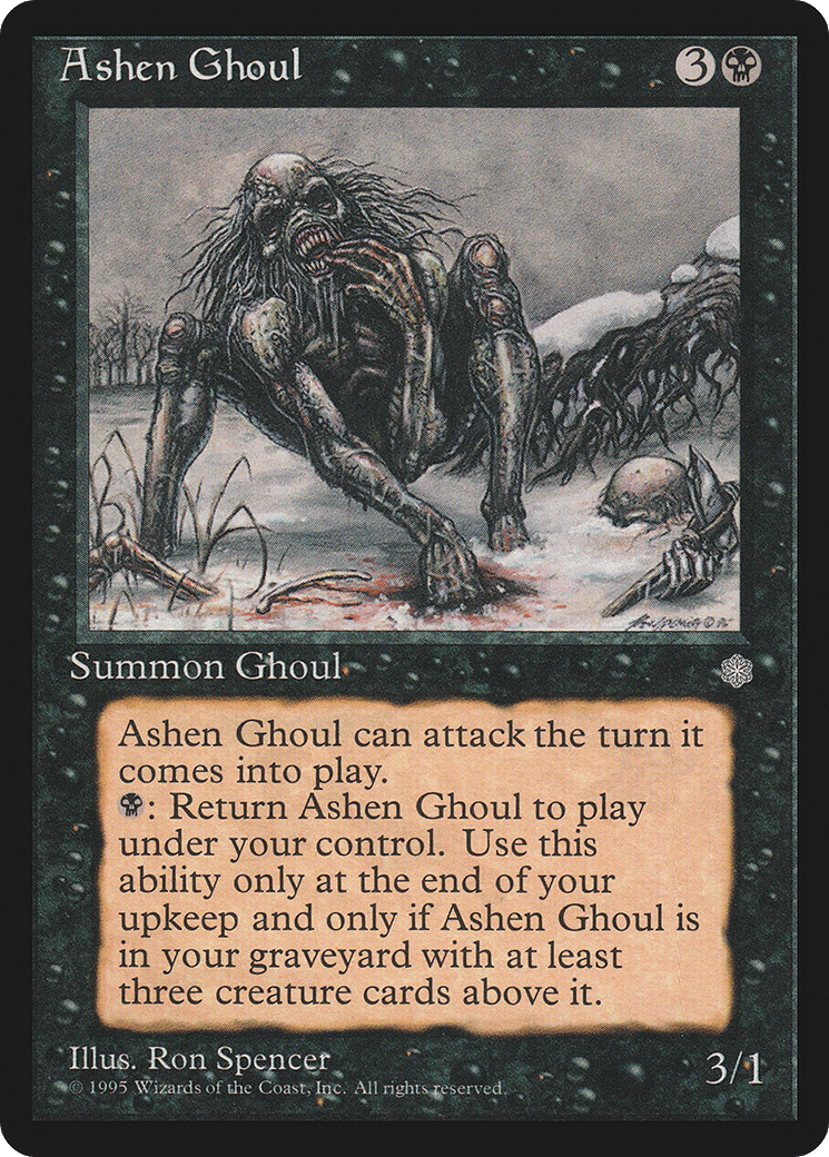 Haste {B}: Return this card from your graveyard to the battlefield. Activate only during your upkeep and only if three or more creature cards are above this card.