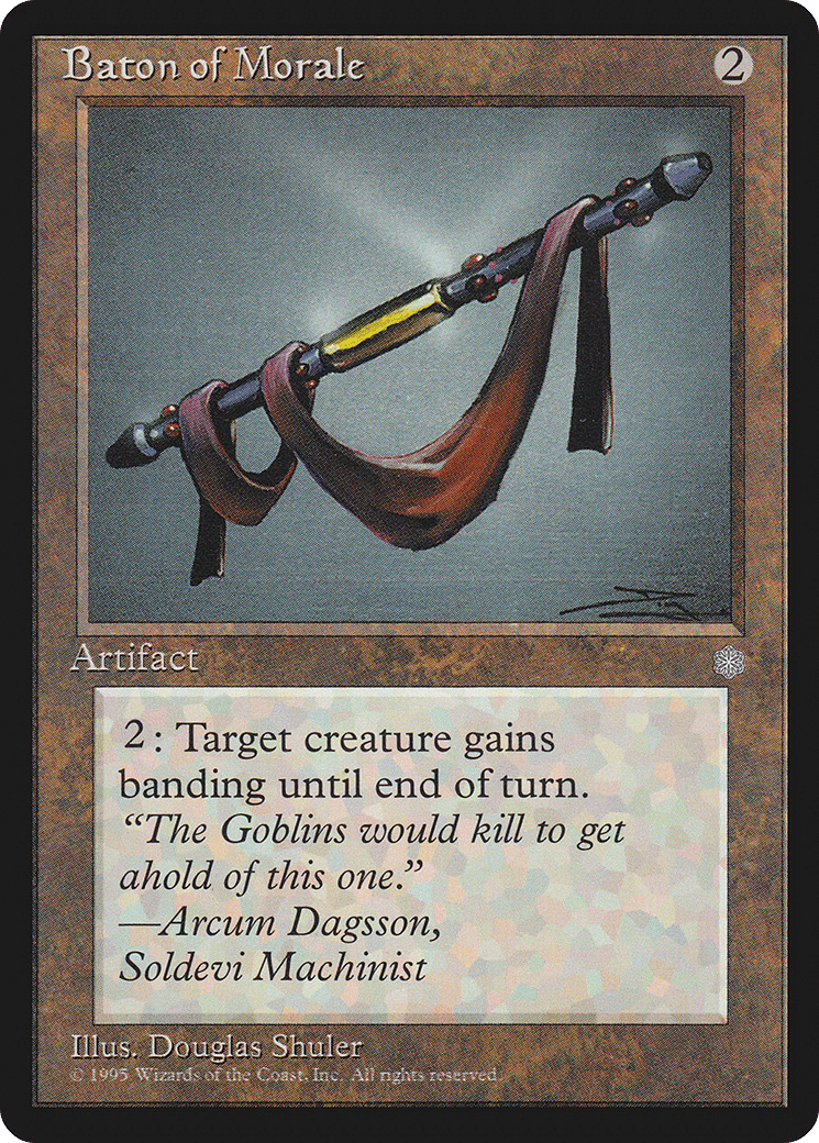 {2}: Target creature gains banding until end of turn. (Any creatures with banding, and up to one without, can attack in a band. Bands are blocked as a group. If any creatures with banding a player controls are blocking or being blocked by a creature, that