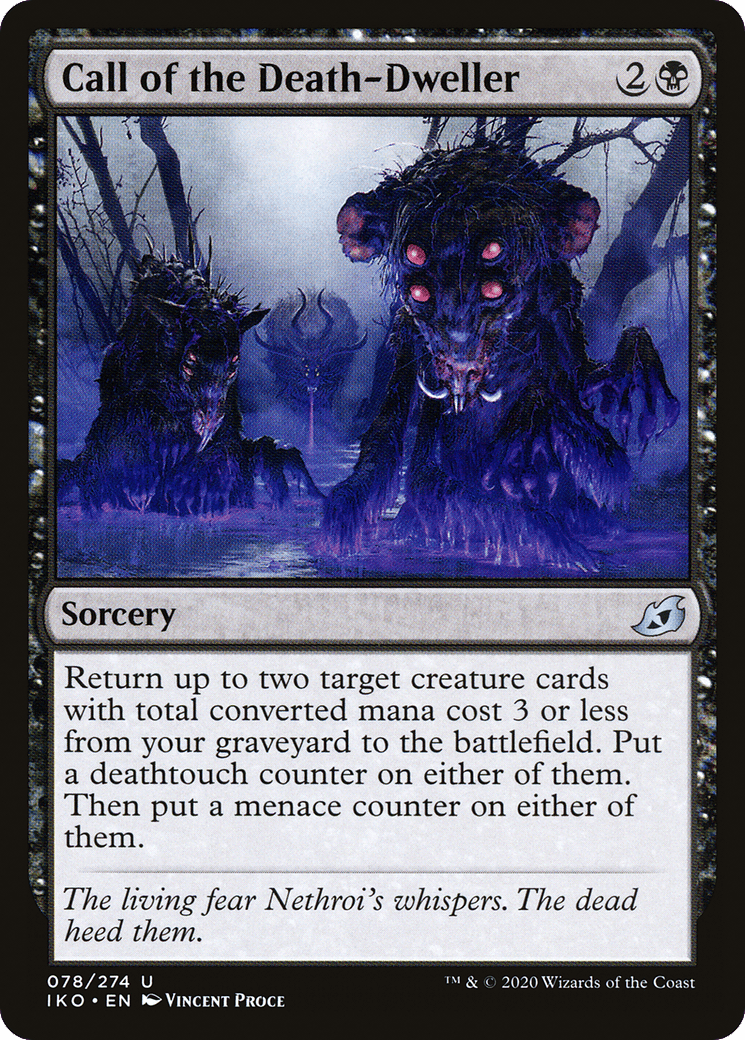 Return up to two target creature cards with total mana value 3 or less from your graveyard to the battlefield. Put a deathtouch counter on either of them. Then put a menace counter on either of them.