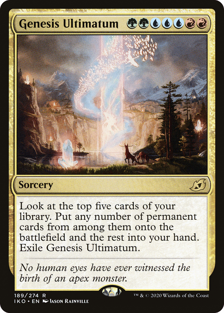Look at the top five cards of your library. Put any number of permanent cards from among them onto the battlefield and the rest into your hand. Exile Genesis Ultimatum.