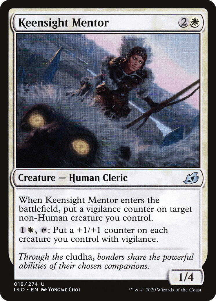 When this creature enters, put a vigilance counter on target non-Human creature you control.