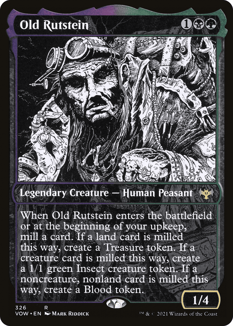 When Old Rutstein enters and at the beginning of your upkeep, mill a card. If a land card is milled this way, create a Treasure token. If a creature card is milled this way, create a 1/1 green Insect creature token. If a noncreature, nonland card is mille