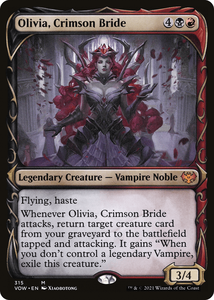 Whenever Olivia attacks, return target creature card from your graveyard to the battlefield tapped and attacking. It gains “When you don’t control a legendary Vampire, exile this creature.”