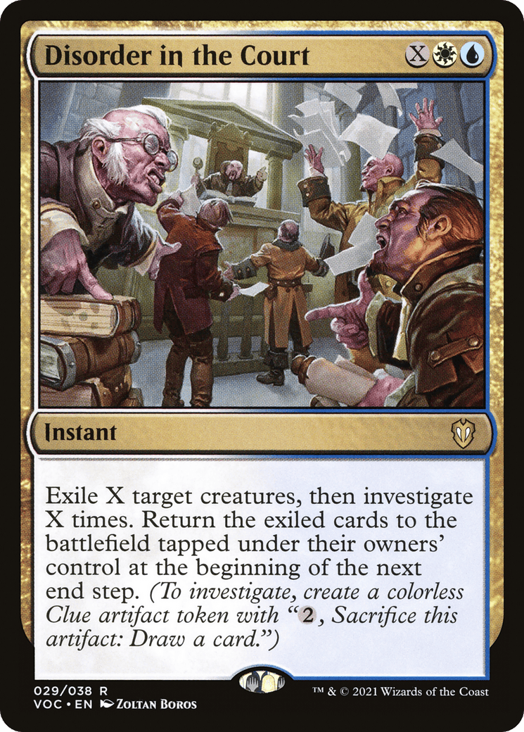 Exile X target creatures, then investigate X times. Return the exiled cards to the battlefield tapped under their owners’ control at the beginning of the next end step. (To investigate, create a Clue token. It’s an artifact with “{2}, Sacrifice this token