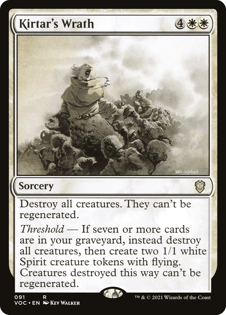 Threshold – If seven or more cards are in your graveyard, instead destroy all creatures, then create two 1/1 white Spirit creature tokens with flying. Creatures destroyed this way can’t be regenerated.