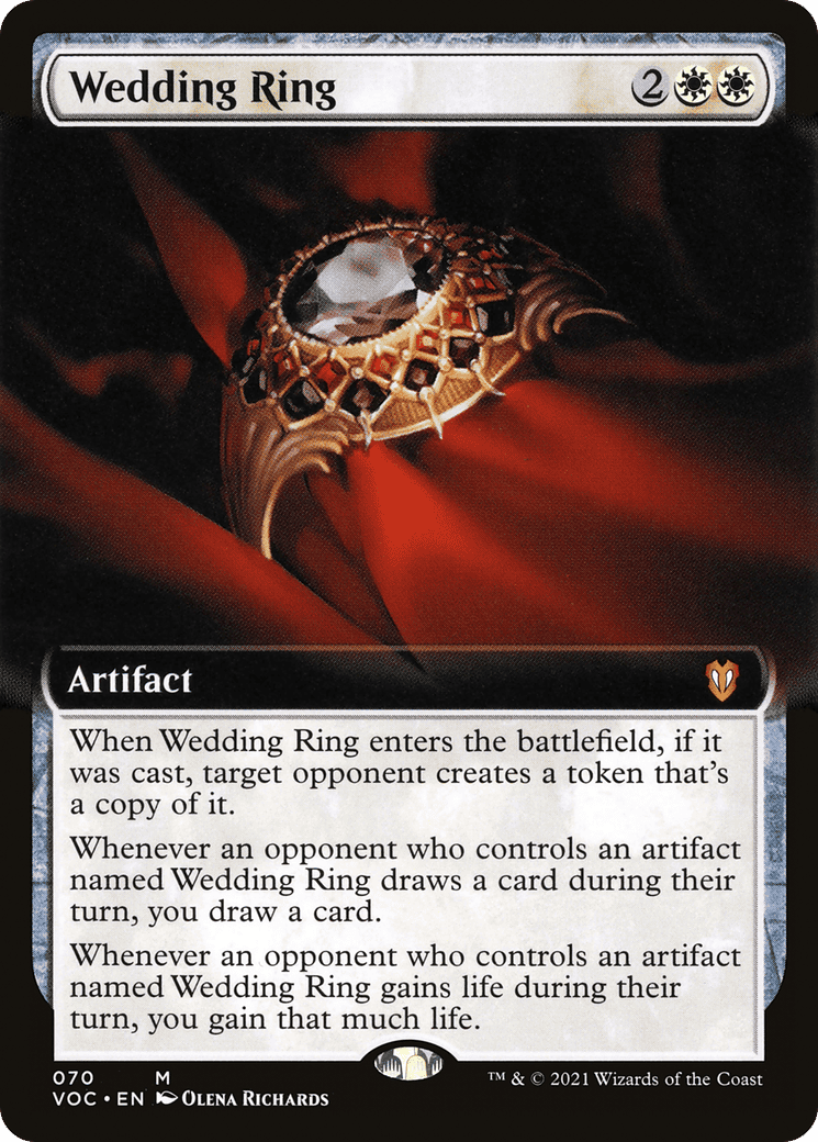 Whenever an opponent who controls an artifact named Wedding Ring draws a card during their turn, you draw a card.