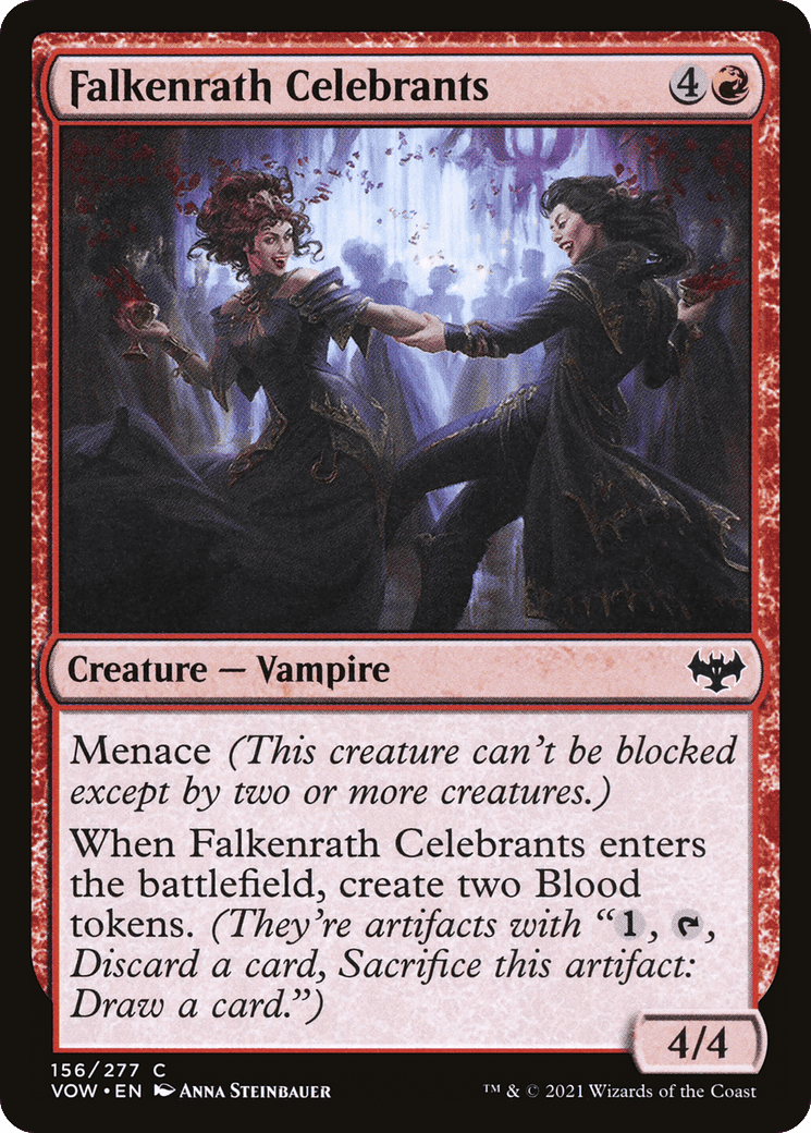 When this creature enters, create two Blood tokens. (They’re artifacts with “{1}, {T}, Discard a card, Sacrifice this token: Draw a card.”)