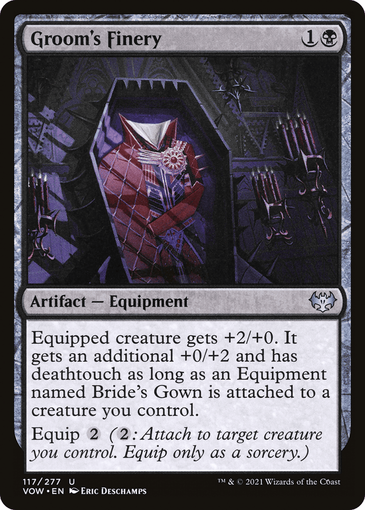Equipped creature gets +2/+0. It gets an additional +0/+2 and has deathtouch as long as an Equipment named Bride’s Gown is attached to a creature you control.