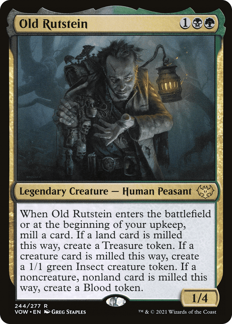When Old Rutstein enters and at the beginning of your upkeep, mill a card. If a land card is milled this way, create a Treasure token. If a creature card is milled this way, create a 1/1 green Insect creature token. If a noncreature, nonland card is mille