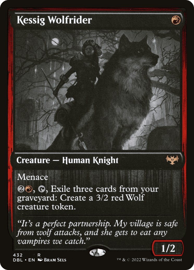 {2}{R}, {T}, Exile three cards from your graveyard: Create a 3/2 red Wolf creature token.