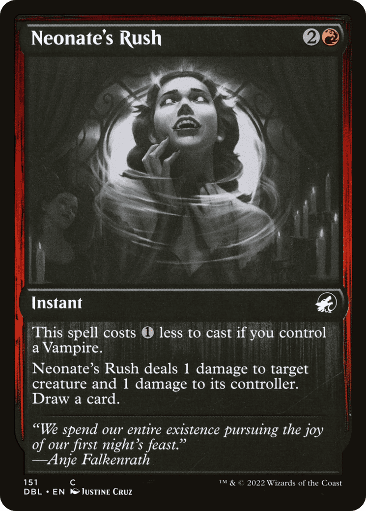 Neonate’s Rush deals 1 damage to target creature and 1 damage to its controller. Draw a card.