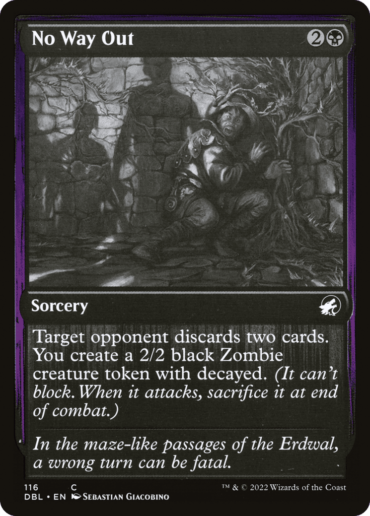 Target opponent discards two cards. You create a 2/2 black Zombie creature token with decayed. (It can’t block. When it attacks, sacrifice it at end of combat.)
