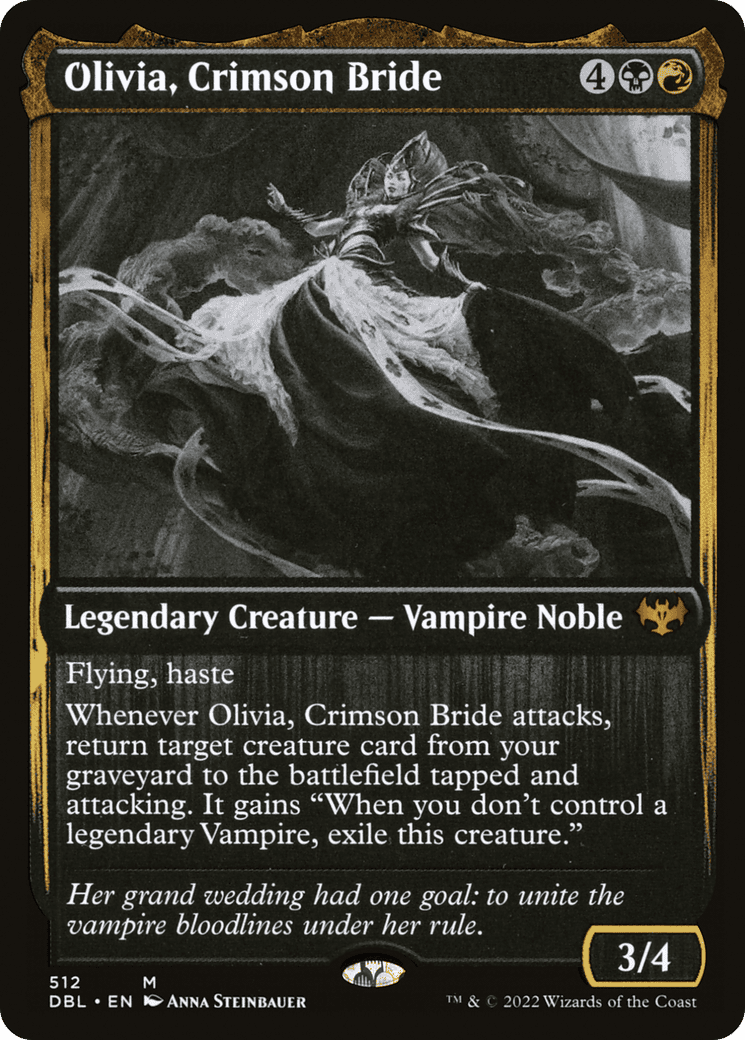 Whenever Olivia attacks, return target creature card from your graveyard to the battlefield tapped and attacking. It gains “When you don’t control a legendary Vampire, exile this creature.”