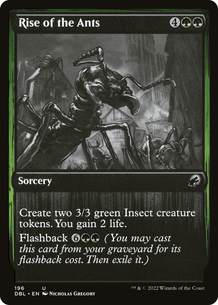 Create two 3/3 green Insect creature tokens. You gain 2 life. Flashback {6}{G}{G} (You may cast this card from your graveyard for its flashback cost. Then exile it.)
