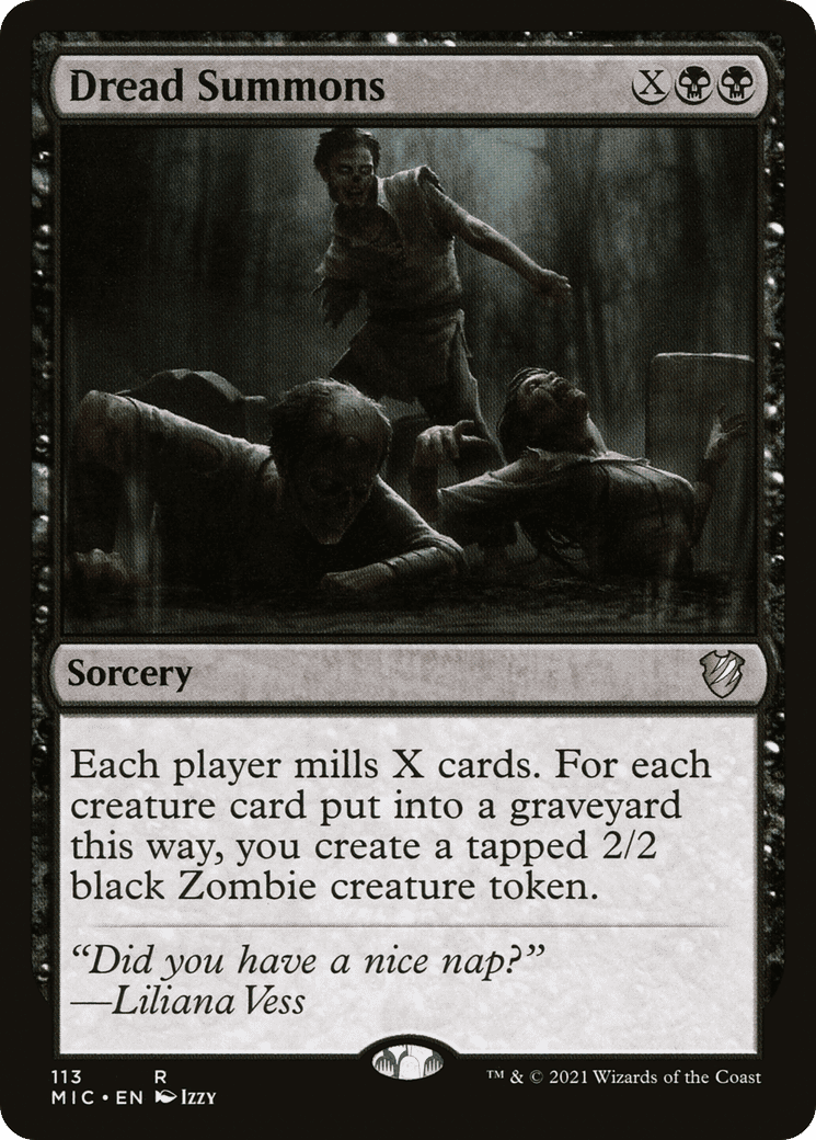Each player mills X cards. For each creature card put into a graveyard this way, you create a tapped 2/2 black Zombie creature token. (To mill a card, a player puts the top card of their library into their graveyard.)