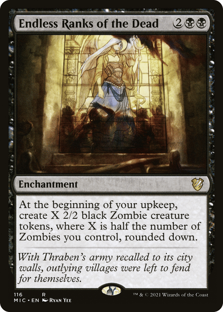 At the beginning of your upkeep, create X 2/2 black Zombie creature tokens, where X is half the number of Zombies you control, rounded down.