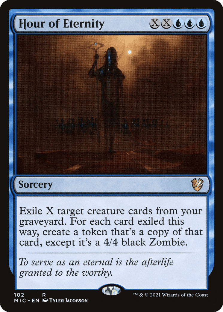 Exile X target creature cards from your graveyard. For each card exiled this way, create a token that’s a copy of that card, except it’s a 4/4 black Zombie.
