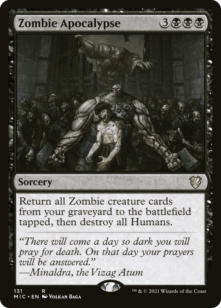 Return all Zombie creature cards from your graveyard to the battlefield tapped, then destroy all Humans.